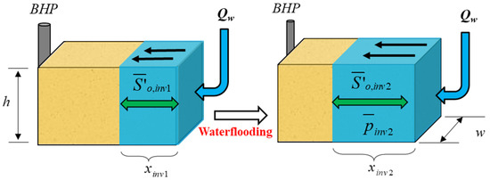 (3) The product of the dynamic conductivity coefficient and the difference between the original formation pressure and the pressure under the current time step proposed by Wattenbarger [23] was used (Equation (20)). Figure 9 schematically illustrates the variation of water saturation during water flooding.