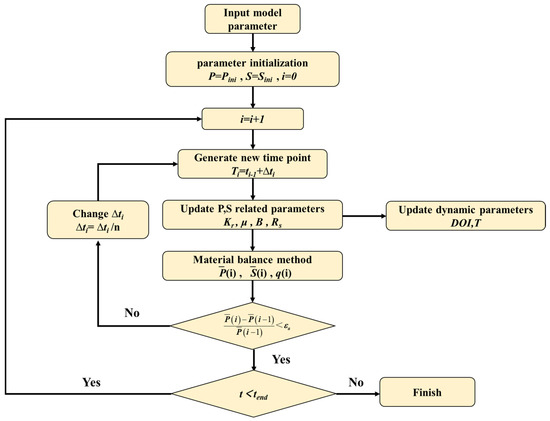 The mean saturation and pressure at each time step in the three regions were calculated through the mass balance method to correct the nonlinear parameters in the semi-analytical model. By calculating the conductivity of each time step, the dynamic drainage distance was obtained to update the dynamic conductivity. Finally, the oil, gas, and water production in each region was obtained. The workflow for the calculation is summarized in Figure 10.