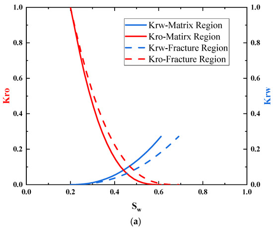 Since this equivalent model equates the fracture region to the hyperpermeability matrix region, different relative permeability curves were adopted between the equivalent fracture region and the matrix, as shown in Figure 13. The Baker linear model was used in the semi-analytical model to calculate the relative permeability of oil, gas, and water (Equation (23)) [31]: