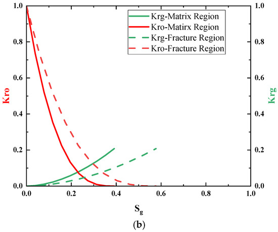 Relative permeability curves of the matrix and equivalent fracture zone: (a) oil–water phase relative permeability curve and (b) oil–gas phase relative permeability curve.