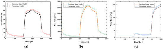 Semi-analytical model verification results: (a) comparison of oil rate, (b) comparison of gas rate, and (c) comparison of water rate.