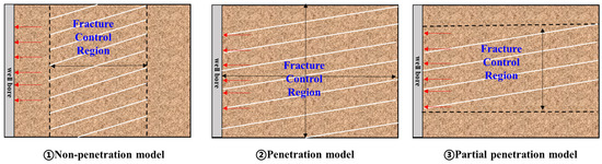 Figure 7 shows the three-zone heterogeneous physical model of a fractured reservoir based on equivalent transformation. The reservoir properties of the inner and outer areas were the same, and the permeability of the fracture area was calculated by the equivalent fracture unit method. The following assumptions were made [27,28]: