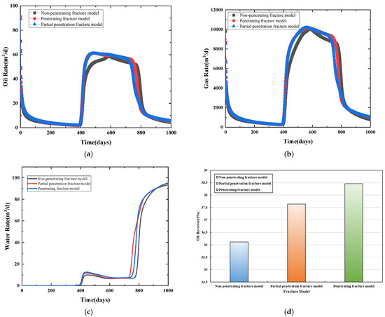 Calculation results of distribution models of different fracture occurrences: (a) comparison of oil rate, (b) comparison of gas rate, (c) comparison of water rate, and (d) comparison of oil recovery.
