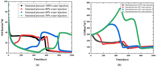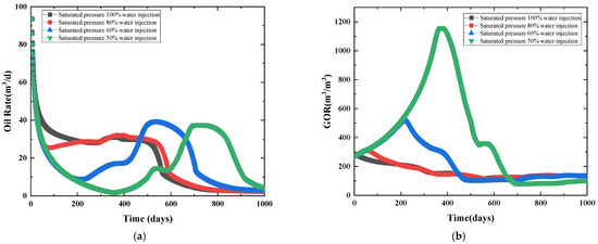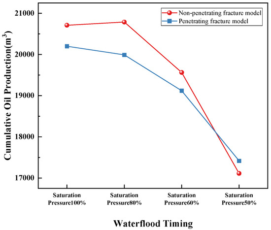 The study analyzed the impact of different water injection timings on productivity by selecting full-penetration and non-penetration fracture models. Water injection was performed when the reservoir pressure reduced to the bubble point pressure, 80% of the bubble point pressure, 60% of the bubble point pressure, and 50% of the bubble point pressure. As shown in Figure 17, Figure 18 and Figure 19, earlier water injection more effectively recovered formation energy, prolonged stable oil and gas production, and resulted in higher cumulative oil production. Delayed water injection led to lower reservoir pressure drops, higher gas–oil ratios during production, and reduced oil and gas output in later stages. For non-penetrating fractures, the highest cumulative oil production was achieved when injection occurred at 80% of the bubble point pressure. In penetrating fractures, earlier water breakthrough necessitated earlier injection timing. For field applications, it is recommended to initiate water injection when the formation pressure drops to 80% of the bubble point pressure to balance cost efficiency and maximize recovery.
