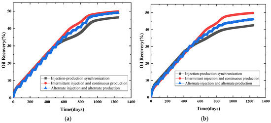 Comparison of recovery efficiency of different fracture models and injection methods. (a) Recovery efficiency of different water-flooding modes using the non-penetrating fracture model. (b) Recovery efficiency of different water-flooding modes using the fracture model.