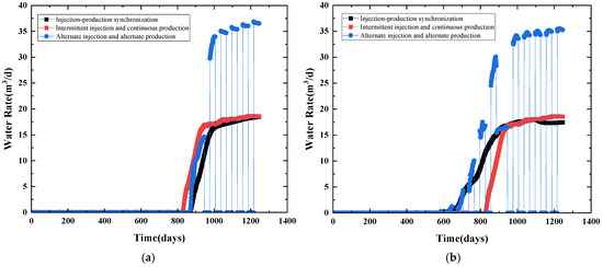 Comparison of the water rate in different fracture models and injection methods. (a) Water rate of different injection methods using the non-penetrating fracture model. (b) Water rate of different injection methods using the fracture model.