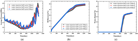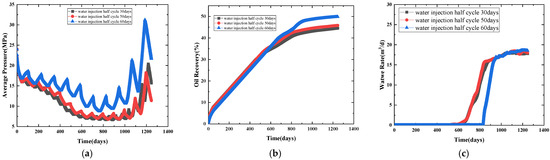 Results of different half-cycle water injections using the fracture model: (a) average pressure, (b) oil recovery, and (c) water rate.