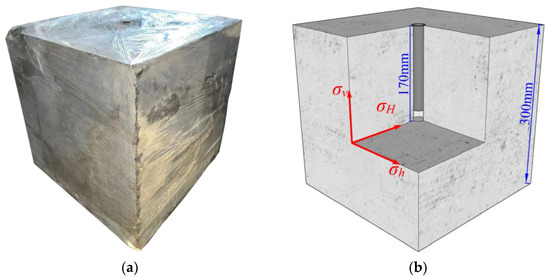 - The triaxial stress loading system was activated and the piston elongation was adjusted to ensure that the hydraulic cylinder indenter was aligned with the surface of the specimen. The three-way stress (σv–σH–σh) was loaded to the target value at a rate of 0.5 MPa/s.