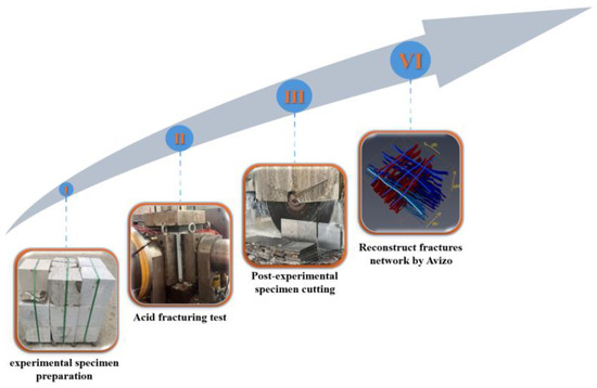 At present, two common and mature means for characterizing internal fractures in rocks are in use. The first method employs tools such as hammers and wedges to fracture the specimen along the rupture surface after the experiment. The exposed fracture surfaces are then marked, and subsequently the fracture surfaces are scanned using either a handheld or stationary three-dimensional scanner. Following repeated scanning, the fracture surfaces are reconstructed and then spliced into the model using software [35]. Alternatively, the specimen can be scanned using CT and reconstructed using slice data to obtain the morphology of the fracture. The initial method is rapid and effective in obtaining the morphology and structure of the fracture, but the capacity to extract the area, length, and width of the fracture is insufficient. The second method is frequently employed in the analysis of small-size specimens, exhibiting enhanced scanning efficacy. However, the penetration capacity of a conventional CT scanner is questionable for specimens with a side length of 300 mm. Moreover, the CT scanning outcomes are more intricate, and some scholars have utilized tomography in conjunction with other techniques. Reconstruction of the hydraulic fracture structure of coal rock using Avizo is feasible; however, in acidic fracturing specimens of carbonate rock, the presence of a considerable number of natural microfractures and acid-etching channels poses a challenge to the accurate determination of the target fracture.