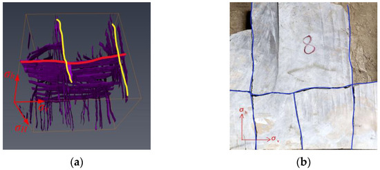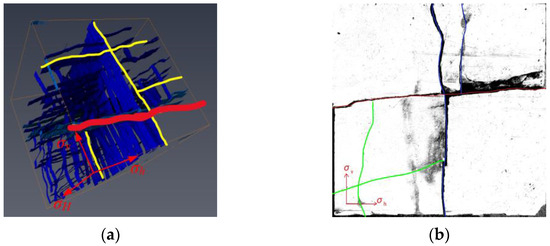As shown in Figure 7, the new acid-etched fracture (red line) of specimen Z-1 generated by fracturing is close to perpendicular to the σH–σv plane, and when it extends outward, it communicates with the natural fracture (yellow line) and forms a certain angle. The fracture network near the wellbore is relatively complex, and the fracture is relatively simple when it reaches the specimen surface. This result aligns with Hou’s experimental findings [31]; however, it differs in that the microfracture inside Z-1 has been penetrated, resulting in steering within a portion of the fracture.