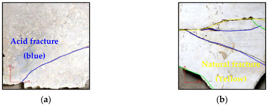 As can be seen from Figure 11 and Figure 12, for the specimens with the same acid system (Z-5, Z-6), despite the different number of natural fractures, the acid fractures also penetrate the natural fractures, which is more similar to the experimental results of Deng [24], with the difference that the deflection of the Z-6 cracks is more influenced by the joints in the rock, and the cracks are not flat and straight.
