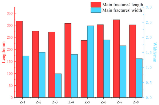As illustrated in Figure 15, for two groups of specimens using the same acid system (Z-2, Z-7), as demonstrated in the previous comparison, as the difference between σh and σH increases, the fracture length increases, but the development direction is more consistent. The large angles of the secondary fractures extend less from the main fractures, generally tending to be parallel to the development of the σH, and the width of the fracture is larger.