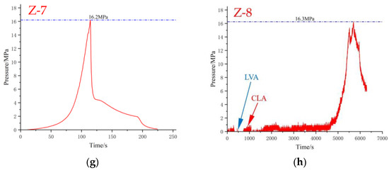 As shown in Figure 18, an analysis of the treatment pressure curves reveals that the curves of certain specimens treated with an acid solution exhibit a more pronounced zigzag pattern, indicating the presence of numerous internal small fractures that are susceptible to communication during fracturing. A comparison of the curves for specimens Z-1 and Z-2 demonstrates that the break of the specimen can be slowed down, and the duration of acid dissolution can be enhanced by increasing the injection of crosslinked acid. The curves of Z-2 and Z-4 demonstrate that an increase in the geostress difference facilitates the opening of internal fractures in the specimen, resulting in a more complex and variable acid flow path. A comparison of Z-5 and Z-6, which utilized the same working fluid, reveals that Z-5, which contains two substantial natural fractures, produced two failure zones, and the peak pressures were lower than those of Z-6, indicating that an increase in the number of fractures can facilitate a reduction in the breakdown pressure and the formation of new fractures. When comparing Z-4 and Z-7, it is postulated that when the Ran fractures are at an angle to σH, the large fractures on either side of the Ran fractures have an angle with σH that is identical to that observed in Z-2 and Z-4. This results in lower peak pressures than those observed in Z-6. A hypothesis may be formed when comparing Z-4 and Z-7; namely, that when an angle exists between a fracture and σH, it becomes easier to form small new fractures on both sides of a large fracture due to uneven stress, thus increasing the effect. The dissolution of acid and the potential for fracture communication are also increased. In contrast to these specimens, Z-3, due to the use of water, has smooth pumping curves, a rapid increase in pressure, and a significant decrease in pressure following breakdown.