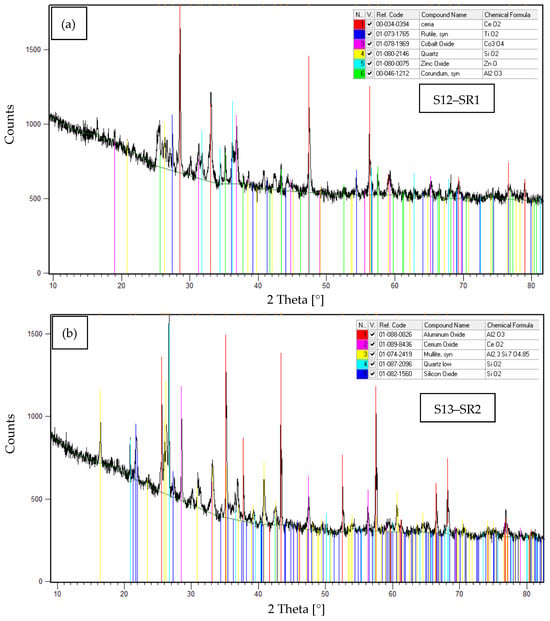 - XRD analysis revealed distinct crystalline phases in the solid residues (SR1–SR4), with stable surrogate phases (CeO2 and Co3O4) and oxidation products (TiO2 and ZnO) from glove decomposition. Temperature-dependent speciation was observed, with Co3O4 reducing to CoO in high-temperature zones (≥900 °C). Reactor-derived contaminants (SiO2, Al2O3, and mullite) were also identified. All samples contained an amorphous fraction (10–25° 2θ).