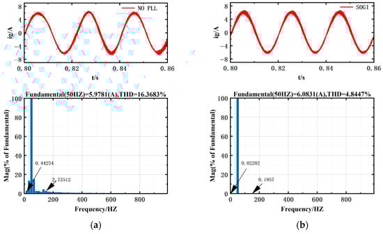 Grid voltage and grid-connected current waveforms: (a) Without the PLL (b) With the EA-SOGI PLL introduced.