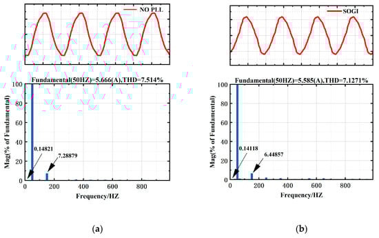 As shown in Figure 14a, without the Phase-Locked Loop (PLL), the system appears to have a faster response and better steady-state performance. However, in this case, the harmonic components of the grid voltage are directly passed to the reference current, causing distortion in the inverter output current waveform and a phase error of 16.2°, which negatively affects the grid quality. As shown in Figure 14b, after introducing the EA-SOGI PLL, the phase error is reduced to 8°, and the waveform distortion is significantly reduced. This demonstrates that the EA-SOGI can significantly improve current tracking performance under steady-state conditions, enhancing the system’s power factor and grid connection quality.