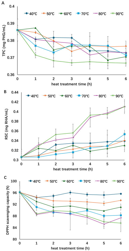 The influence of thermal treatment on the TPC, RSC, and DPPH radical scavenging activity of the concentrated extract is shown in Figure 1. As treatment time and temperature increased, the TPC and antioxidant activity showed a declining trend while the RSC increased. The TPC decreased by about 5% at the highest temperature of 90 °C, suggesting degradation of phenolic compounds during thermal treatment [11,14]. Although steady decreases in TPC were observed during all thermal treatments, no significant differences were found among most treatments. Only the highest temperature treatment (90 °C) showed significant differences from the other treatments. Meanwhile, the degradation of TPC was the fastest at 90 °C, as the lowest TPC was always found in the 90 °C treatment. A longer treatment time could expose more phenolic compounds to oxygen and light that resulted in the degradation of these compounds and decline of TPC as the heat treatment continued [11]. The RSCs of samples treated at a relatively low temperature (<80 °C) increased by approximately 7–15%, while the RSCs of samples treated with a higher temperature (80 or 90 °C) increased by approximately 35%, indicating that more polysaccharides degraded under higher heating temperatures. Significant differences in the RSC during the treatment were observed between higher temperatures (80 and 90 °C) and lower temperatures (40–70 °C), while no significant differences were found within the two temperature groups. Although the RSC of the extracts increased during thermal processing, the antioxidant activity decreased by 0.5~10% as the treatment temperature increased from 40 to 90 °C, which suggests that the antioxidants in the A. nodosum extract are thermally sensitive and their activity could be dependent on phenolic content [15,27]. Similar to that of RSC, significant differences were observed between lower-temperature (40–60 °C) and higher-temperature groups (70–90 °C), but not within each group.