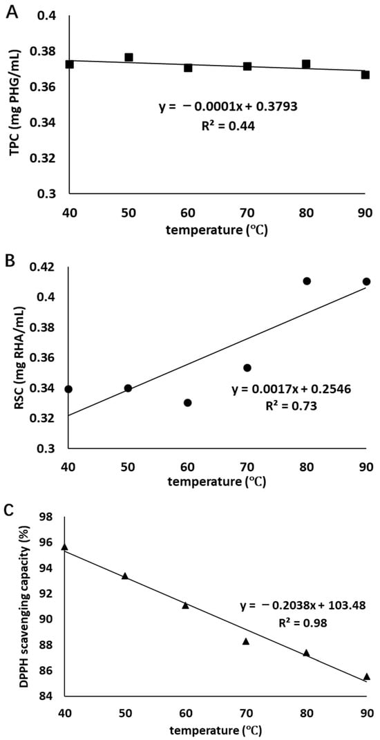 Figure 2. Correlations between TPC (■, graph (A)), RSC (●, graph (B)), and antioxidant activity (▲, graph (C)) at the end of heat treatment and treatment temperature.