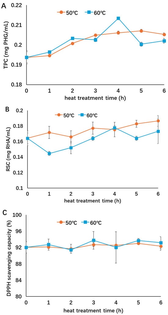 The stability of supernatants obtained without rotary evaporation was evaluated to investigate the influence of thermal treatment on the composition and thermal stability of the non-concentrated extracts to evaluate the influence of the solvents used for dissolving the extract. Similar to the concentrated extracts, the RSC of supernatants treated at 50 and 60 °C both increased (Figure 3), suggesting degradation of polysaccharides under thermal treatment. No significant change in antioxidant activity was observed. However, the TPC of non-concentrated extract increased during the treatment, probably because polyphenols were released from their bindings with other components such as polysaccharides during thermal treatment [11,18]. When the influence of different treatment temperatures was considered, no significant difference was observed in the TPC, RSC, or antioxidant activity between the two temperatures. Compared with the concentrated extract in Figure 2, the non-concentrated extract showed a better thermal stability at both 50 and 60 °C, suggesting that the solvent could help to preserve the bioactivity of the extract at relatively lower heating temperatures, probably by reducing dissolved oxygen and thereby slowing the oxidative process of phenolic compounds.