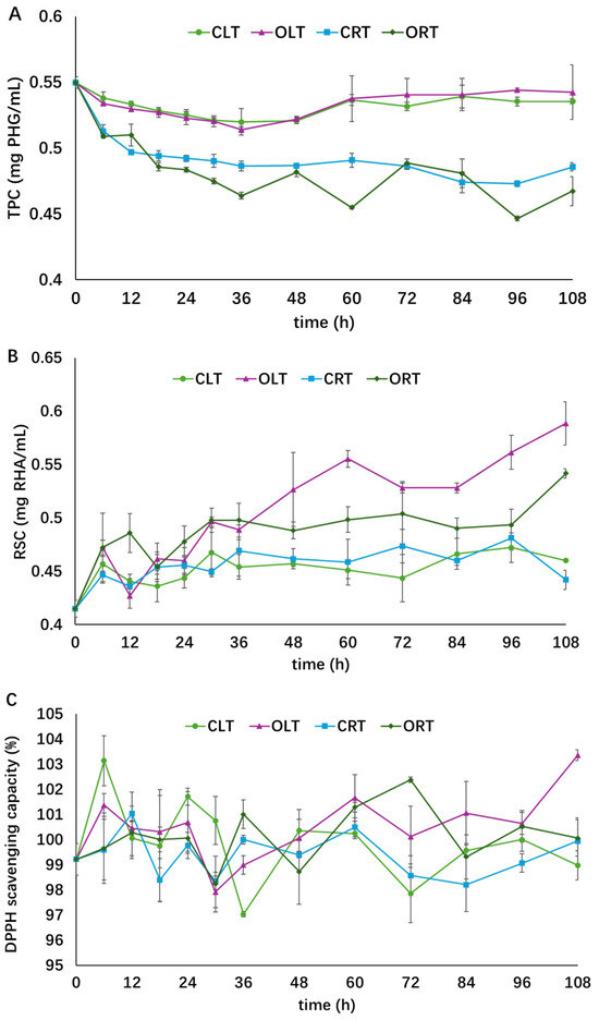 The influence of storage conditions on extract stability was also investigated. Four groups of concentrated extracts were placed in sealed centrifuge tubes to avoid direct contact with air, stored in a 4 °C refrigerator (closed low temperature, CLT), at room temperature (closed room temperature, CRT), or placed in open tubes, stored at 4 °C (open low temperature, OLT) and at room temperature (open room temperature, ORT) for 108 h. In each test, 1 mL extract was placed in a 1.5 mL centrifuge tube, and the tubes were placed in varying conditions as previously described. In all treatments, the extracts were not dried before stability testing because the intended use of the extracts was mainly for fresh seafood storage, which usually involves high water activity. Because fresh seafoods usually have a shelf life of 3–4 days at 4 °C, the storage stability of the extract was tested for a maximum of 108 h. The volume of the groups OLT and ORT was adjusted by adding deionized water to compensate for liquid evaporation during storage. The results are expressed as At/A0, where At is the bioassay (TPC, RSC, or DPPH scavenging capacity) at treatment time t and A0 is the bioassay at the very beginning of thermal treatment.