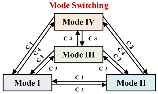 The dynamic triggering mechanism (20) and (21) is developed for mode switching adaptively. Figure 3 shows the mode switching logic, in which mode transition process can be triggered by twelve switching conditions. Assuming that the initial operating mode is Mode III, if a voltage violation occurs, condition C1 is satisfied and Mode I will be activated and remain in effect until violation is mitigated. Taking the switching sequence Mode III–IV–I–III as an example, the operating mode initially operates in Mode III. Mode IV is selected for DG inverter while both voltage and current violations occur simultaneously. If the voltage violation still persists after DG management, the operating mode will be switched to Mode I. Once the voltage violation is eliminated, Mode III is reactivated. Therefore, adaptive mode switch can be achieved to adjust DG inverter strategy, which improves flexible operation performance of distribution network.