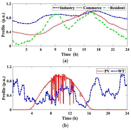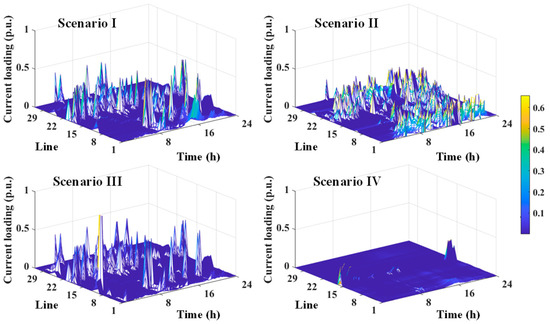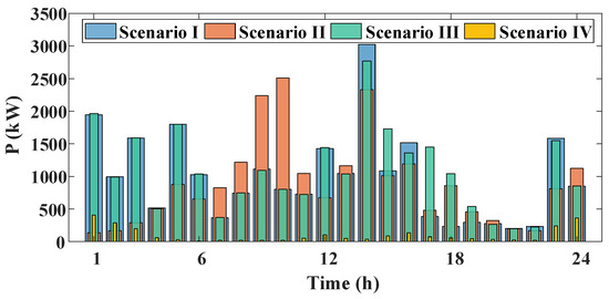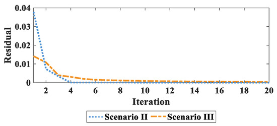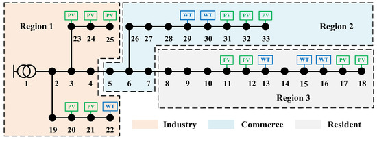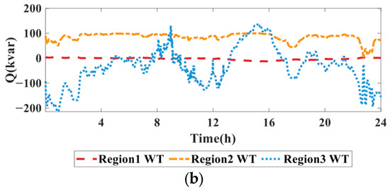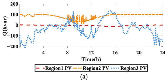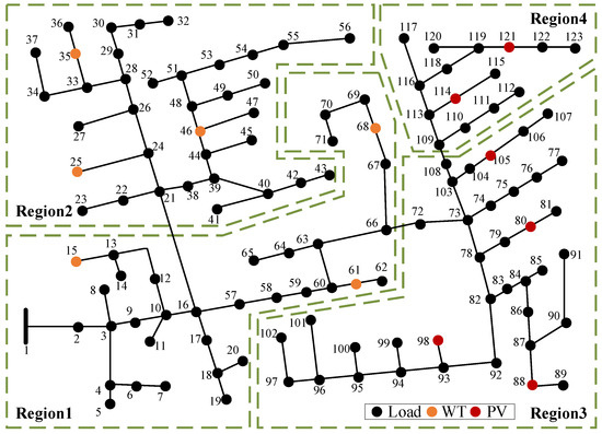 To verify the scalability of the proposed method, the modified IEEE 123-node distribution network is adopted. The system topology and regional partitioning adopt the results from [38] and are shown in Figure 17. Twelve DG units are integrated into the system, and their types, locations, and capacities are detailed in Table 7. All DG inverters are equipped with reactive power compensation functions. The network is partitioned into four regions: Region 1 (commercial), Region 2 (industrial), and Regions 3 and 4 (residential). The total active and reactive power demands of the system are 3.49 MW and 1.92 Mvar, respectively. The Scenarios I and II in Section 3.1 are also carried out in the test case.