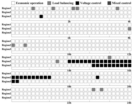 - Based on the actual operational requirements of different regions, four control modes are defined: voltage control, load balancing, economic operation, and mixed control. Each region adaptively selects the appropriate mode according to its operating conditions with the shared measurement data, thereby enhancing the overall operational flexibility of the distribution network.