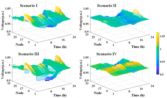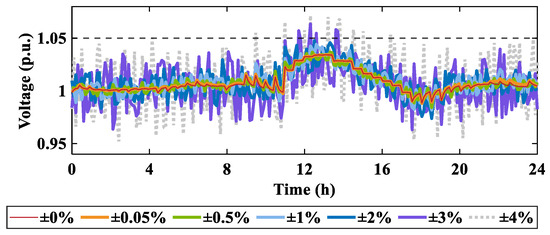 As shown in Figure 15 and Table 6, when the measurement error is less than ±1%, the voltage control performance is almost identical to that under error-free conditions. As the error increases to ±2%, voltage fluctuations slightly increase but remain better than the initial operating state in Scenario I. However, when the error exceeds ±3%, voltage fluctuations rise sharply and even surpass the upper voltage limit of 1.05 p.u. This is because a ±3% error already accounts for a considerable portion of the allowable operating voltage range (±10%) in distribution networks. Therefore, the proposed method is insensitive to small measurement errors (≤±2%), but when the error exceeds this threshold, the control performance deteriorates rapidly and may even worsen the operating state of the distribution network.