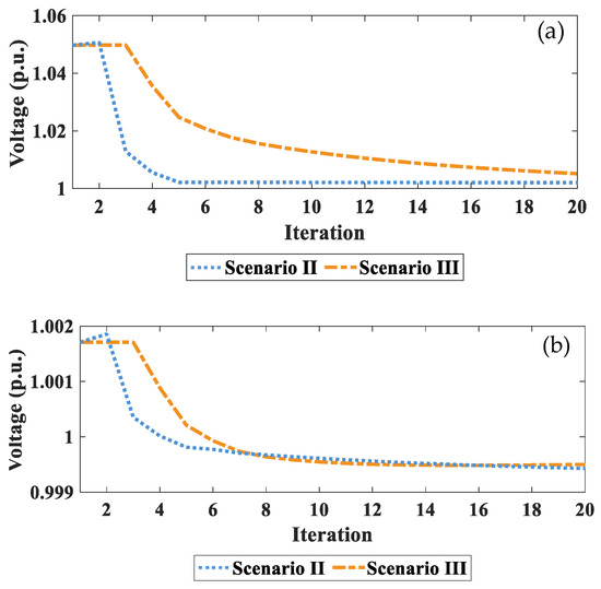 As shown in Figure 16, at the 30th and 90th iterations, the system switches between State 1 and State 2, and the sudden change in PV output causes voltage fluctuations. When , the proposed method restores the voltage to around 1.0 within a single iteration, with a computation time of approximately 0.0642 s per iteration, indicating that the method can quickly restore the voltage level. Moreover, the parameter has a significant impact on convergence characteristics: larger values result in slower convergence and smoother voltage adjustments, while smaller values lead to faster convergence but may cause overshoot. When the adjustable capacity of devices is sufficient, an excessively small may induce large overshoot and system oscillations. Therefore, in practical applications, it is recommended to initially adopt a relatively large and then adjust it gradually according to the actual control performance.