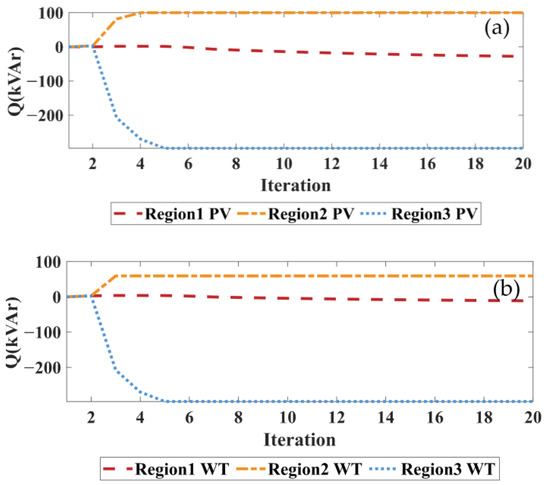 Based on the updated mode mapping matrix, each region applies the gradient descent method to solve the objective function given by Equations (13)–(19), deriving the iterative calculation formula for the DG reactive power output as follows: