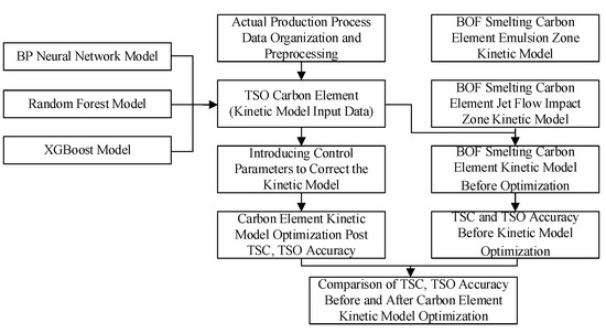 Predicting the end-point carbon content in basic oxygen furnace (BOF) steelmaking is a crucial foundation for achieving stable control of molten steel composition [10]. The Back Propagation (BP) neural network is a multi-layer feedforward neural network based on the error back-propagation algorithm, which exhibits strong nonlinear fitting capability and is therefore suitable for modeling complex, mechanism-unclear processes with intricate variable interactions [11]. The Random Forest model is an ensemble learning method composed of multiple decision trees; it improves prediction stability through voting or averaging strategies and is particularly effective for problems with high-dimensional features, moderate sample sizes, and requirements for model interpretability [12]. The Bayesian optimization using random forest (forest_minimize) converges stably within 15–20 iterations, with the objective function (e.g., carbon deviation) showing consistent improvement and saturation. Repeated trials confirm low variation in optimal solutions, demonstrating good robustness due to the ensemble nature of the random forest surrogate model. XGBoost (Extreme Gradient Boosting) is an optimized algorithm built on the gradient boosting framework, which supports regularization to prevent overfitting and enables parallel computation for enhanced efficiency [13]. In this work, these three data-driven modeling approaches were employed to predict the end-point steel composition in BOF operations, yielding predicted values of the tapping steel oxygen (TSO) carbon content. Subsequently, the predicted TSO results were used as input conditions for a kinetic process prediction model, enabling further optimization and closing the loop of the dynamic process simulation. Figure 1 shows the flowchart of the research methodology adopted in this study.