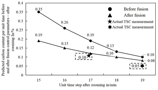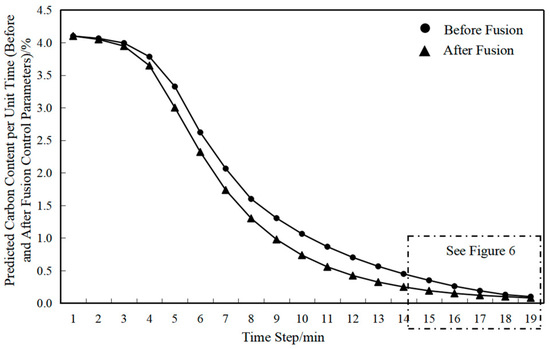 To evaluate the predictive capability of the control-parameter-integrated kinetic model, the dual-point hit rate at the mid-blowing stage (TSC, Tapping Sample Carbon before tapping) and at the end-point (TSO, final carbon content) is adopted as the core performance metric. The model’s prediction accuracy is systematically analyzed across different error tolerance bands. Taking a real production heat as an example, the following control parameter values are set: Hot metal charge mass: 220 t, Lance height range: 1.5–1.8 m, Lance flow rate: 282 Nm3/min, Flux addition: 6500 kg. A comparison of the predicted carbon content (mass%) with and without integrated control parameters is presented in Figure 5, with a close-up view of the mid- and end-point regions shown in Figure 6.