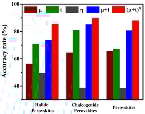 Accuracy rate for μ, t, η, (μ + t), and (μ + t)η as a descriptor to predict the relative stabilities among two perovskites [18].