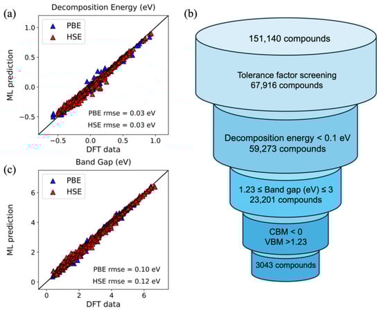 Parity plots for RGF models showing effective test predictions over 4000 runs plotted against ground truth DFT values for (a) decomposition energy per formula unit and (c) band gap. The screening procedure for identifying suitable perovskites for water splitting is pictured in (b) [46].