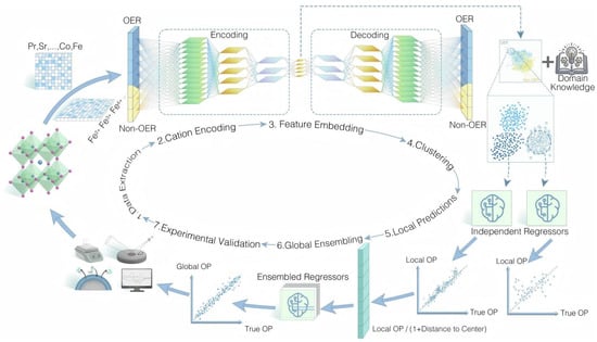 The oxygen evolution reaction (OER) is a key anodic half-reaction in electrocatalysis. Perovskite oxides doped with selected transition metals, such as LaCuO3 with B-site Co or Ni, have emerged as efficient OER catalysts. Li et al. [49] combined DFT-augmented datasets with Gaussian process regression to predict high-OER perovskite oxides, using composition and bulk-electronic descriptors with recursive feature elimination and an adaptive, uncertainty-aware learning strategy, yielding 10 stable and active double perovskite oxides such as KRbCo2O6 and BaSrCo2O6 from 4000 candidates. Chang et al. [50] introduced a transfer-learning framework for alkaline OER, building OER and non-OER datasets from literature, encoding cations with an autoencoder, clustering by K-Means and phase ranking, and using a tuned gradient boosting regressor with global ensembling and active learning, which identified high-performance compositions such as Pr0.1Sr0.9Co0.5Fe0.3Mn0.3O3 (Figure 6).