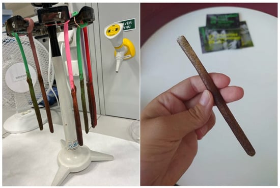The dipping method was conducted by immersing a salt-filled latex balloon into the gelatin–starch–SCG mixture 20–25 times, depending on the gelation onset during cooling. The solution was maintained at 55–60 °C throughout the process using a thermostatically controlled magnetic stirrer to ensure consistent temperature. All mixtures were prepared with fixed concentrations (5 g gelatin, 0.5 g starch, and 0.75 g SCG in 25 mL distilled water) and stirred for 10 min to ensure homogeneity and consistent viscosity. Each immersion lasted approximately 5 s, followed by a 5–10 s interval before the next dip to allow initial layer setting without premature gelling of the entire mixture. These steps were standardized across all samples to enhance reproducibility. The dipping method involved immersing the latex balloon 20–25 times into the gelatin–starch mixture contained in a volumetric cylinder. The number of dips was selected based on the rate at which the gelatin mixture began to gel upon cooling, ensuring sufficient layer buildup before solidification occurred. The example of experimental straw production is shown in Figure 1. The compositions of experimentally produced biodegradable straws are presented in Table 1.