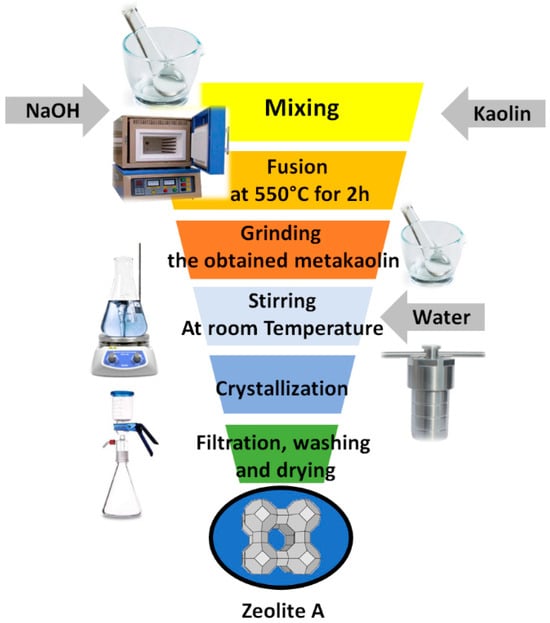 An amalgamated fusion/hydrothermal methodology, as described in previous studies [14], was employed to produce zeolite A from kaolin. Based on the results of the XRF analysis, the SiO2/Al2O3 molar ratio of the raw kaolin was determined to be 2.362 (Table 1). NaOH was used by considering the NaOH/kaolin ratio of 0.9. Fused kaolin was created by combining 10 g of kaolin with 9 g of NaOH, grinding the mixture in a mortar for 15 min, and then fusing it for two hours at 550 °C. The combined product was ground up, dissolved in 100 mL of deionised water, then stirred for 5 h, and left to stir at room temperature for five hours. The mixture was put in a Teflon-coated stainless-steel autoclave, and the heating temperature and crystallization time were adjusted to 90 °C and 20 h, respectively. After the heated product was filtered through a suction device, it was repeatedly cleaned with distilled water to eliminate any remaining NaOH, and it was left to dry overnight at 80 °C in an oven. Figure 1 illustrates the synthesis process steps of LTA zeolite.