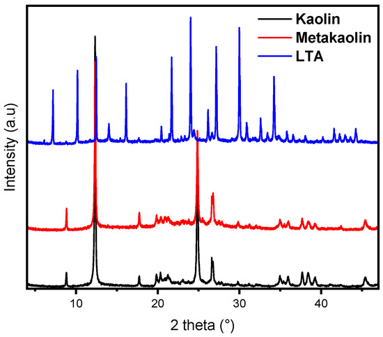 XRD patterns of kaolin, metakaolin, and LTA zeolite.