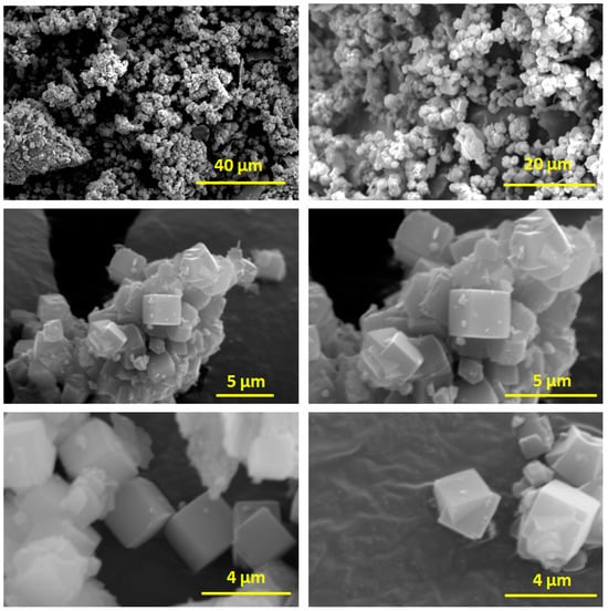 Figure 4 presents the SEM images of the prepared LTA zeolite. At lower magnifications (40 μm and 20 μm scale bars), the images display aggregates of diminutive, irregularly shaped particles, indicating the preliminary phases of crystallisation and the presence of precursor material. With further magnification (5 μm scale bars), distinct cubic crystals became apparent inside the aggregates, indicating the successful nucleation and development of the LTA zeolite phase. These cubic crystals are indicative of LTA zeolite and exhibit a significant degree of homogeneity in both morphology and dimensions [42,43]. At maximum magnification (4 μm scale bars), distinct cubic crystals are observable, displaying smooth surfaces and sharp edges. The crystals measure roughly 2–3 μm, validating the successful conversion of kaolin into high-quality LTA zeolite. The uniform cubic morphology and limited size distribution shown in the photos suggest effective crystallization and the establishment of distinct zeolite structures, crucial for enhanced adsorption characteristics and efficacy in heavy metal remediation.