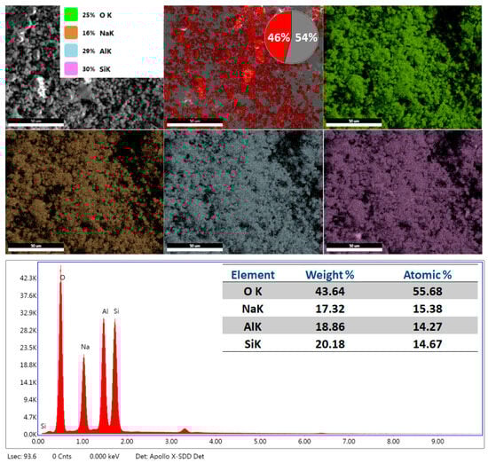 Energy Dispersive Spectroscopy (EDS) provides detailed information about the elements present in the sample, such as silicon (Si), aluminium (Al), oxygen (O), sodium (Na), and other elements. Figure 5 shows EDS spectra of the prepared LTA zeolite. The SEM-EDS study validates the effective hydrothermal synthesis of zeolite LTA (Linde Type A) from kaolin precursors, as demonstrated by the distinctive element composition and morphological characteristics. The elemental mapping indicates a uniform distribution of framework components: oxygen (43.64 wt%, 55.68 at%) as the primary bridging element, silicon (20.18 wt%, 14.67 at%) and aluminum (18.86 wt%, 14.27 at%) constituting the tetrahedral framework, with a Si/Al molar ratio of approximately 1.03, aligning with the theoretical LTA structure that necessitates Si/Al ≈ 1.0 for optimal ion-exchange characteristics [44,45]. The red zone in the elemental mapping corresponds to regions where the concentration of the analyzed element is highest, indicating a uniform and locally intense distribution of key components such as oxygen, silicon, and aluminum within the LTA zeolite structure. The substantial sodium concentration (17.32 wt%, 15.38 at%) signifies the existence of charge-balancing Na+ cations within the zeolitic cavities, crucial for the cation exchange process that facilitates heavy metal adsorption applications. The SEM micrographs illustrate the development of distinct cubic crystallites characteristic of LTA topology, exhibiting a uniform particle size distribution and the absence of amorphous phases, thereby affirming the complete conversion of the clay aluminosilicate precursor into the intended zeolitic framework under alkaline hydrothermal conditions, essential for attaining elevated adsorption capacity and selectivity in wastewater treatment processes.