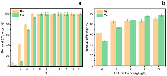 (a) Influence of initial pH, conditions: [Cu2+]0 = [Pb2+]0 = 80 mg/L, LTA zeolite dosage 10 mg/L and room temperature. (b) Effect of LTA zeolite adsorbent dosage on the removal of heavy metals from wastewater, conditions: [Cu2+]0 = [Pb2+]0 = 80 mg/L, pH = 5 and room temperature.