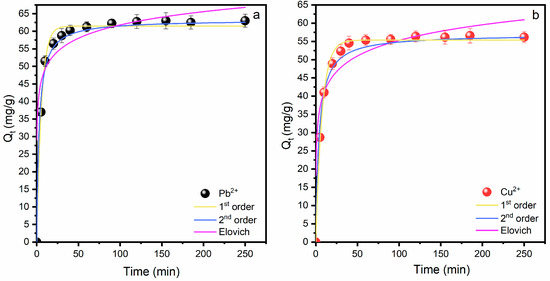 Kinetic modelling of Pb2+ and Cu2+ removal: mechanistic insights from First-Order, Pseudo-Second-Order and Elovich models: (a) Pb2+ and (b) Cu2+. Conditions: [Cu2+]0 = [Pb2+]0 = 80 mg/L, LTA zeolite dosage 10 g/L, pH = 5 and room temperature.
