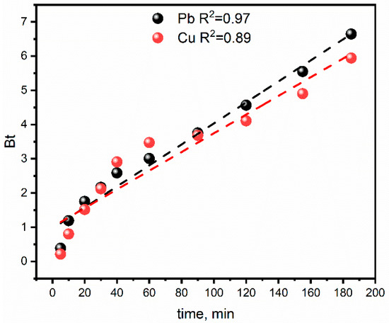 Plot of Bt vs. t for the adsorption of copper and lead ions. Conditions: [Cu2+]0 = [Pb2+]0 = 80 mg/L, LTA zeolite dosage 10 g/L, pH = 5 and room temperature.