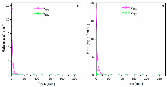 where kche [g/(mg·min)] and kphy (1/min) represent the chemisorption and physisorption rate coefficients, respectively. The left side term (dQt/dt) can be estimated by applying the second-order kinetic model (Equation (S2) in Supplementary Information) to obtain the first derivative of Qt with respect to time t. The rates of physisorption and chemisorption can be evaluated through Equations (5) and (6) (Figure 9):