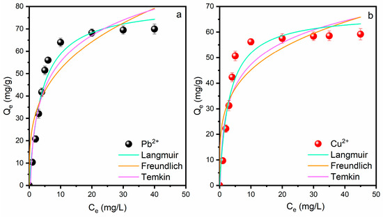 Application of isothermal models to adsorption data: (a) Pb2+ and (b) Cu2+. Conditions: LTA zeolite dosage 10 g/L, pH = 5, and room temperature.