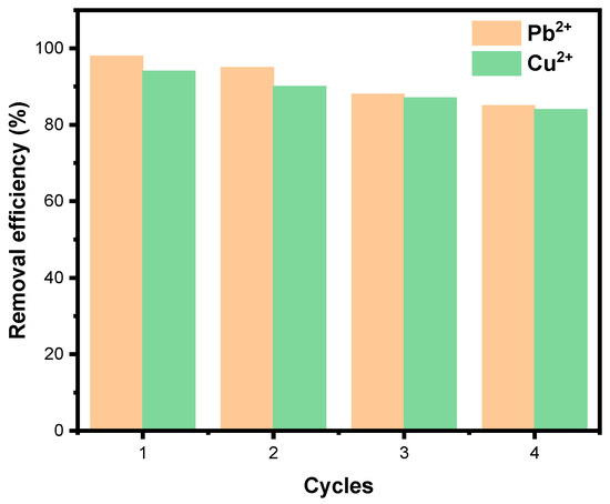 Reusability performance of LTA zeolite for Cu2+ and Pb2+ removal over successive cycles. Conditions: [Cu]0 = [Pb]0 = 80 mg/L, LTA zeolite dosage = 10 g/L, pH = 5 and room Temperature.