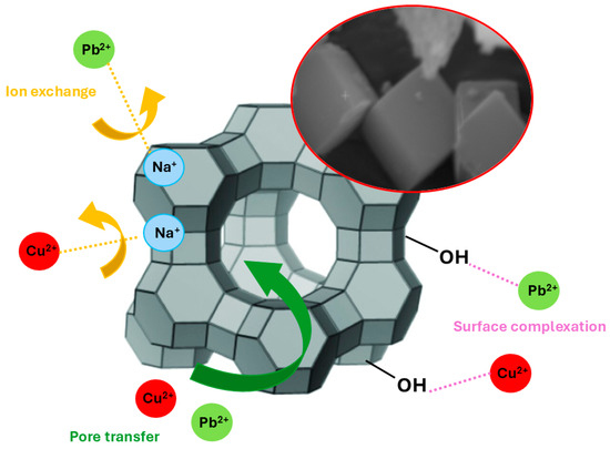 The developing world is recently facing the scarcity of pure and clean water due to an immense increase in population and industrialization [1]. The contamination of wastewater with heavy metals, resulting from rapid industrialisation and intensive human activities such as mineral processing, petrochemical operations, metal plating, mining, smelting, and battery manufacturing, has become a major global concern due to its significant environmental and health risks [2,3]. The concentration of heavy metals in soil, groundwater, and various water bodies is exceeding the acceptable limits in many countries as a result of unplanned urbanisation, industrialisation, population growth, and poor management policies, leading to a hidden threat to the human food chain [4]. Heavy metals like lead and copper, commonly found in industrial effluents, are non-biodegradable and tend to accumulate in the environment, leading to serious health issues in humans, including stunted growth, neurological impairments, organ damage, and cancer, as well as causing severe harm to ecosystems [5,6]. If these toxic heavy metals in the aquatic environment are transferred and amplified by aquatic animals, they may pose severe health risks to humans [7]. To address these challenges, a variety of techniques have been developed for the removal of heavy metal ions from wastewater, including chemical precipitation, ion exchange, chemical coagulation, membrane processes, and adsorption [3,8]. However, many treatment methods have some drawbacks, such as high energy requirements, complex operation, and limited conditions [9,10,11]. Among these, adsorption stands out as one of the simplest and most effective methods [12], owing to its low initial cost, straightforward design, and ease of operation, especially when using adsorbents with a high affinity for target metals [13]. Zeolites, in particular, are highly promising adsorbents due to their unique properties such as ion exchange capacity, strong affinity for heavy metal cations, and proven chemical and mechanical stability, making them excellent candidates for the treatment of metal-contaminated wastewater [14,15,16].