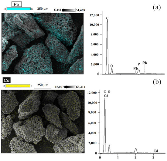 Figure 1 shows the SEM images of AC-PS obtained before adsorption. The figures show that the obtained AC-PS has a rough surface composed of cavities and protuberances. The presence of these protuberances and cavities favors the adsorption operation since they allow the penetration of ions into the solid surface. SEM was also used to identify the presence and the position of the adsorbate in AC-PS after adsorption. Analyzing the spectra presented in Figure 2a,b, it is possible to observe the presence of lead and cadmium, respectively. In all samples, there is also a presence of phosphorus, which remained after the activation step. Although its exact influence was not quantified in this study, the persistent presence of phosphorus may affect the adsorption performance of AC-PS, for instance, by competing with metal ions for active sites or modifying the surface chemistry. SEM images in Figure 2a,b show that the ions tend to deposit homogeneously on the carbon surface.