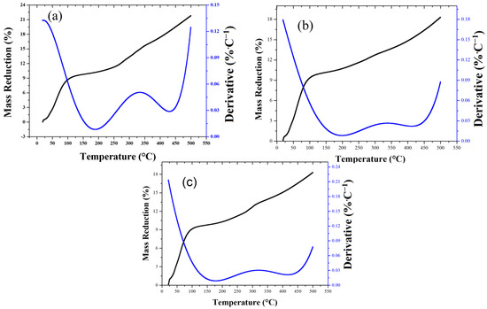 Figure 3 shows the thermogravimetric analysis (TGA) and derivative curves (DTGA) of AC-PS before and after lead and cadmium absorption. Mass loss occurred in distinct temperature ranges: moisture loss (15–150 °C), decomposition of light volatiles (150–300 °C), and decomposition of heavier volatiles and the carbon matrix (300–500 °C). All samples exhibited an initial mass reduction of ~12.5% up to 300 °C, primarily due to moisture and light volatiles. Between 300 and 500 °C, pristine AC-PS lost 21.8% of its mass, whereas AC-PS after metal adsorption showed slightly lower loss (18.3%), indicating that adsorbed Pb2+ and Cd2+ enhance thermal stability. This effect is likely due to interactions between metal ions and surface functional groups, making the carbon matrix more resistant to degradation. DTGA peaks support this interpretation, showing that the maximum rates of mass loss are slightly lower or shifted to higher temperatures for AC-PS after metal adsorption, consistent with enhanced resistance to thermal degradation. Similar behavior was reported by Kozyatnyk et al. [27] for biochars from wheat straw, softwood, and peach stones produced at 550 °C. They observed mass losses of 16 to 18.7%, which were attributed to incomplete carbonization during pyrolysis.