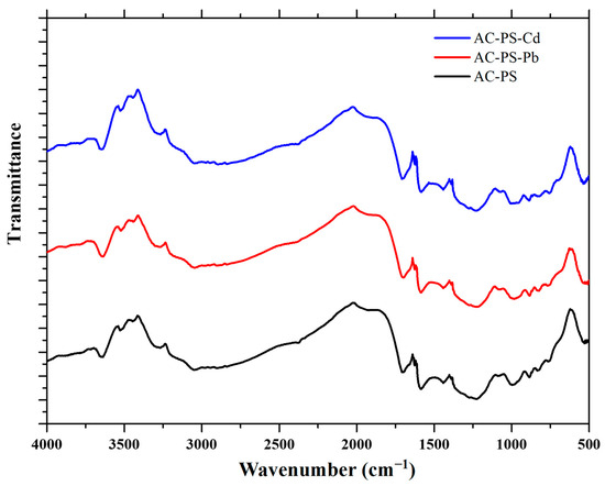 FTIR of activated carbon from peach stones (AC-PS) before ( and after lead (AC-PS-Pb) and cadmium (AC-PS-Cd) adsorption.